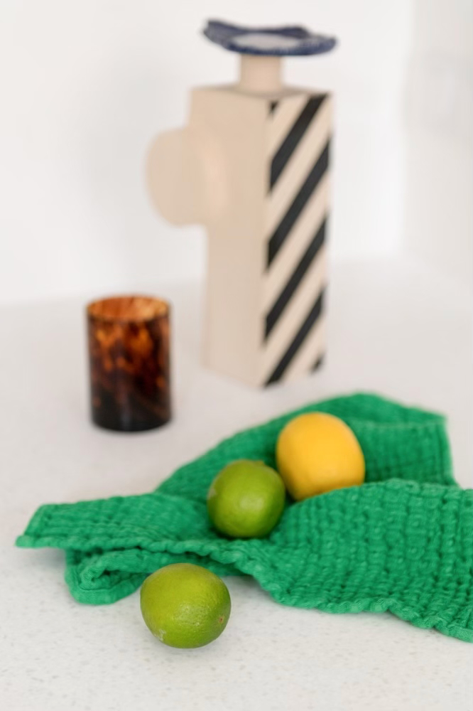 Le grès blanc travaillé brut est mis en contraste avec l’’émail coloré de la coupelle et une face émaillée parée de rayures noires.