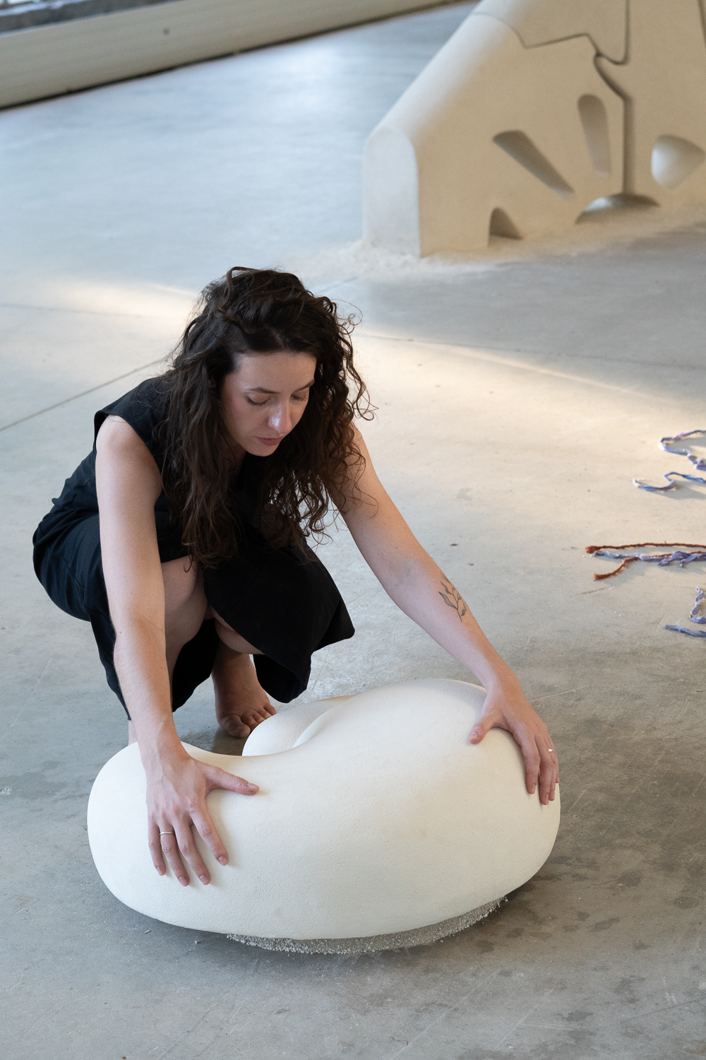 Au cœur de cette exposition, Manon Oller présente M-ONDES, une sculpture monumentale réalisée en résidence dans l’atelier du sculpteur Guy Bareff. Cette œuvre centrale naît d’un travail exploratoire qui incarne ses propres reliefs intérieurs.