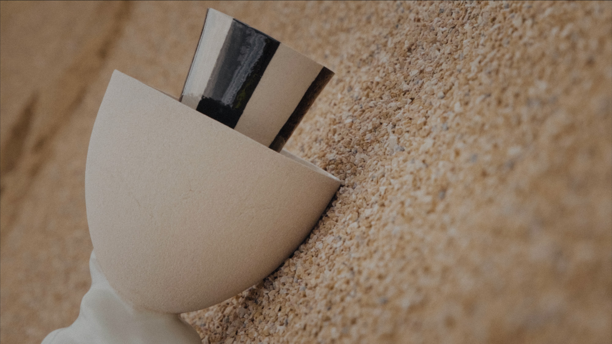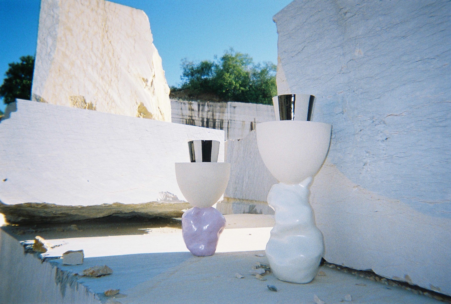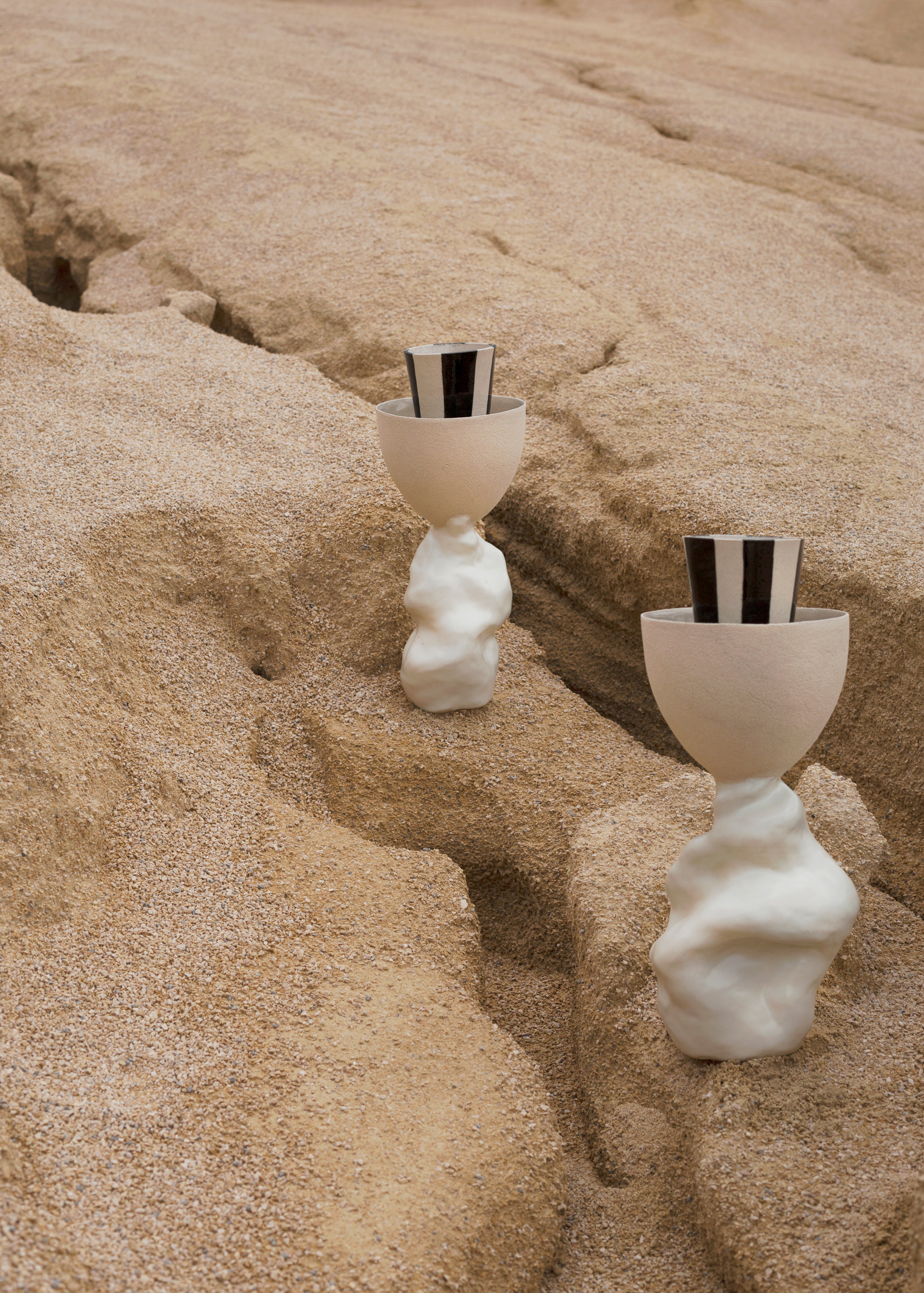 Chacune des pièces est issue d’une recherche autour de trois formes, réalisées chacune avec une technique différente, puis assemblées. La partie supérieure est l’élément qui lie les pièces entre elles. Tandis que la partie inférieure est une sculpture unique, résultat d’une recherche instinctive de forme.