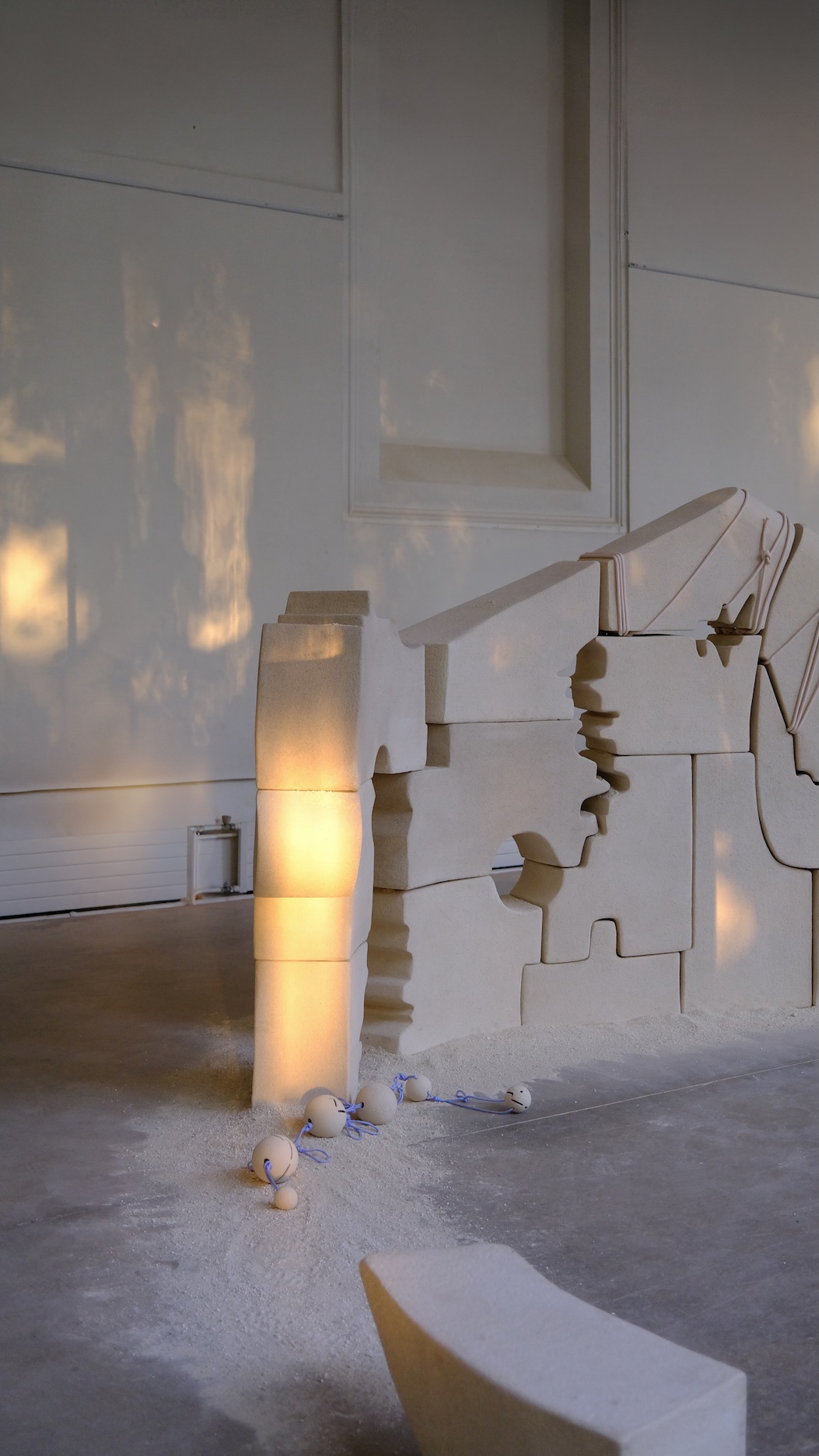 Émergeant du sol comme une vague fossile ou une dorsale terrestre, l’œuvre sculpturale M—ONDES déploie sa ligne sinueuse, vivante et fluide. Elle devient horizon à habiter. La matière — argile, fragments, failles — révèle un récit en construction, une narration sensible faite de strates et de rencontres. La corde enlace certains fragments selon la technique du shibari : autant de nœuds d’une histoire que de gestes de réparation. Abri et espace protecteur, l’œuvre incarne une intimité primordiale où la vulnérabilité se love. Entre archaïsme et invention, cette forme convoque à la fois le totem, la coquille et le vestige.